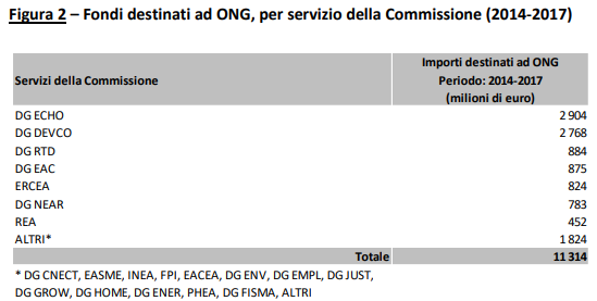 A livello europeo le ONG affiancano la Commissione europea per ideare, attuare e monitorare programmi UE in molti settori d’intervento, quali gli aiuti umanitari e l’aiuto allo sviluppo, l’ambiente, la ricerca e l’innovazione. Si stima che, nel periodo 2014-2017, in molti settori d’intervento dell’UE, dagli aiuti umanitari e allo sviluppo, alla protezione dell’ambiente alla ricerca, la Commissione abbia impegnato 11,3 miliardi di euro, demandandone l’esecuzione ad organizzazioni senza finalità di lucro. Di questi, la quota più significativa (5,4 miliardi, ossia il 50% dell’ammontare destinato alle ONG) è stata assorbita dal capitolo di budget “Ruolo globale dell’Europa” in cui si contabilizza l’impegno delle istituzioni europee allo sviluppo sostenibile e agli aiuti umanitari, in poche parole la cooperazione internazionale.