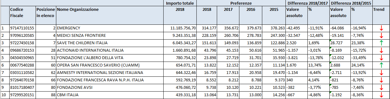 In vetta alla classifica il settore della cooperazione è rappresentato come sempre dalle grandi ONG sanitarie. Emergency è stabile al secondo posto assoluto dopo AIRC con 314.177 firme (ne perde 42.000 dall’anno precedente), segue Medici Senza Frontiere con 228.159 preferenze (32.000 in meno). Segue Save the Children con 151.613 firme, una tra le pochissime ONG a guadagnare terreno (+ 1,7%) seguita a ruota da CUAMM che incassa un aumento del 13%.