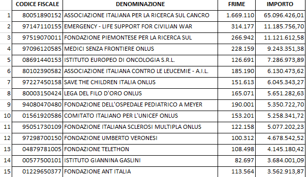 Pensate però che oltre 10.000 enti registrati per il 5 per mille portano a casa meno di 250 euro (che vuol dire massimo una decina di firme) e 2554 enti addirittura raccolgono zero firme e non hanno quindi diritto a nessun contributo. L’elenco è comunque lunghissimo e totalizza quasi 500 milioni, per l’esattezza quest’anno gli italiani ne hanno destinati 495 milioni dalle loro dichiarazioni dei redditi.