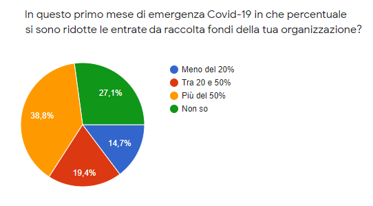 L'ultima parte dell'indagine è dedicata alle criticità e alla percezione delle organizzazioni rispetto alla sostenibilità economica davanti alla crisi che si prospetta all’orizzonte. Il 40 % delle ONG rispondenti dichiara che in questo primo mese di emergenza Covid-19 le proprie entrate da raccolta fondi si sono ridotte almeno del 50%.