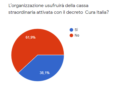Quasi la stessa percentuale (il 37%) usufruirà della cassa integrazione straordinaria messa a disposizione dal decreto Cura Italia. 35 organizzazioni la attiveranno per meno di 10 dipendenti, 9 organizzazioni tra 10 e 20 dipendenti e solo 4 organizzazioni la metteranno in campo per più di 20