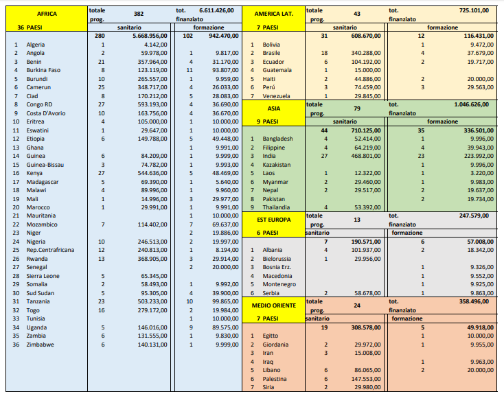 Sono 541 i progetti finanziati in 65 Paesi del mondo per un totale di circa 9 milioni di euro grazie allo stanziamento della Conferenza Episcopale Italiana per l’emergenza coronavirus in Africa e in altri Paesi partner di cooperazione. A seguito della manifestazione d’interesse aperta nel mese di aprile scorso, il Servizio per gli interventi caritativi a favore dei Paesi del Terzo Mondo della CEI ha proceduto a selezionare le numerose richieste secondo criteri specifici per i progetti in ambito sanitario e formativo. Nel dettaglio, sono 381 le iniziative approvate in ambito sanitario per un totale di 7.486.900 euro e 160 quelle nel settore formativo per 1.502.328 euro. Ecco di seguito la suddivisione geografica dei progetti approvati.