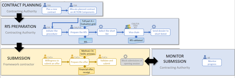 Gestione dei contratti: Per contratti specifici nell'ambito di un contratto, ad esempio SIEA 2018, AUDIT 2018, PSF 2019 (FPI), EVA 2020, EVENTS 2020. PIC necessario: i Framework Contractors hanno registrato i loro profili nel portale F&T. Hanno ottenuto un PIC ufficiale e identificato un PCoCo.