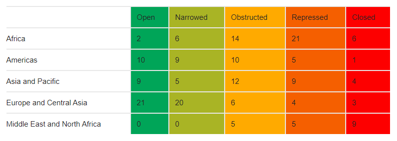 Quest'anno undici paesi sono stati declassati e solo due hanno migliorato il loro rating. La situazione è particolarmente preoccupante nelle Americhe, dove quattro paesi hanno peggiorato la loro valutazione: Costa Rica, Cile, Ecuador e Stati Uniti. Allarmante è anche il deterioramento dello spazio civico in Africa occidentale, con quattro paesi - Costa d'Avorio, Guinea, Niger e Togo - che passano da ostruiti a repressi.