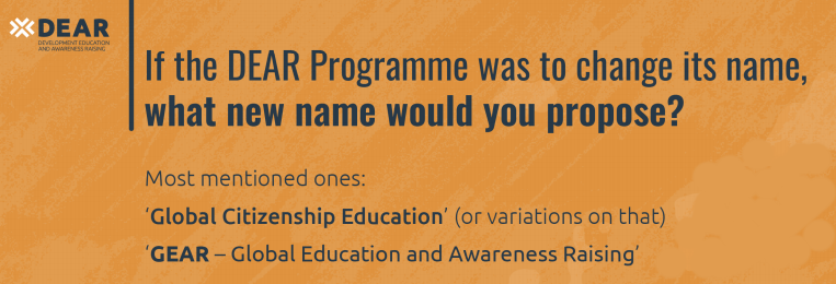 Infine, il sondaggio ha cercato di raccogliere suggerimenti per un eventuale nuovo nome del programma DEAR, una questione che può sembrare solo di forma ma racchiude invece l’orizzonte verso il quale ci si muove. La maggioranza degli intervistati ritiene necessario un cambiamento che vada verso il concetto di "Educazione alla cittadinanza globale" (o variazioni su questo). Una proposta più volte menzionata è GEAR "Global Education & Awareness Raising".