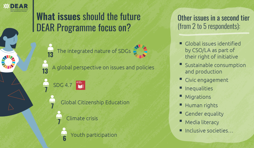 Una parte importante del campione ha evidenziato la necessità di promuovere la comprensione pubblica e l'azione dei cittadini sulle sfide globali verso un cambiamento sistemico, espresso con risposte spesso articolate che menzionano la promozione di valori democratici, voci critiche, società plurali e diversificate, politiche trasformative-sostenibili e il contrasto a modelli discriminatori. Un'altra domanda del survey ha esplorato le opinioni sulle priorità del futuro programma DEAR che per la maggioranza restano ancorate agli SDGs e alla loro natura integrata globale e interconnessa, la maggior parte delle risposte sottolineano la necessità di una prospettiva globale su questioni e politiche e menzionano concetti come solidarietà globale, soluzioni globali a problemi globali, coerenza delle politiche per lo sviluppo e aiuto allo sviluppo. Circa la metà dei rispondenti sostiene che il programma DEAR non si integra sufficientemente con altre iniziative esistenti a livello nazionale ma sottolinea la necessità di abbracciare la diversità alla base del settore DEAR coinvolgendo di più i diversi attori che la compongono.