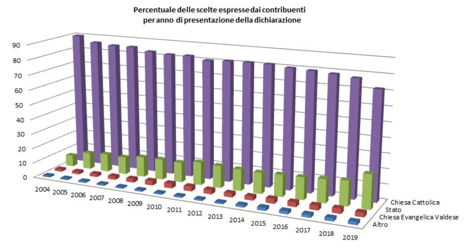 Sul sito del dipartimento delle Finanze (del Ministero dell’Economia e delle Finanze) vengono pubblicati ogni anno i dati statistici sulle scelte dei contribuenti e sugli importi dell’8 per mille destinati allo Stato ed alle Confessioni Religiose. Gli ultimi disponibili si riferiscono all’anno di erogazione 2021 (anno di imposta 2017). Dal report si può evincere che, anche per quest’anno, la maggior parte dei contribuenti ha destinato l’8 per mille alla Chiesa Cattolica che si aggiudica oltre un miliardo di euro grazie ai 13.520.527 di contribuenti che hanno espresso una preferenza in suo favore. Un numero che però si riduce costantemente come si può evincere da questo grafico che mostra una crescita delle preferenze accordate allo Stato e alle altre 11 confessioni religiose firmatarie di un’intesa con lo Stato italiano che prevede la possibilità di ricevere l’8xmille del gettito IRPEF.