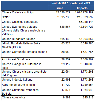 Ecco di seguito le scelte valide registrate nelle dichiarazioni dei redditi 2017, fondi che verranno ripartiti nel 2021.