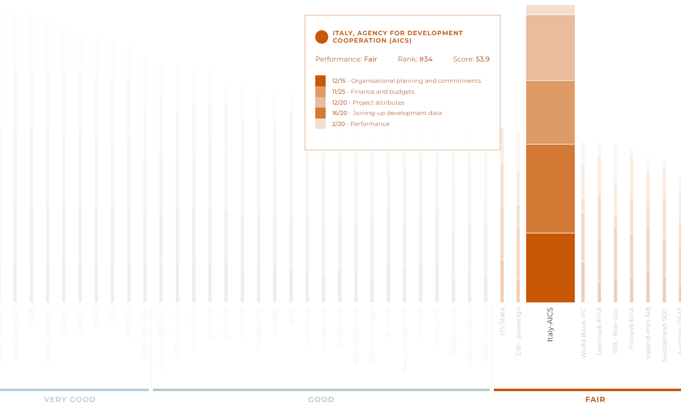 Nella relazione di dettaglio sull’operato dell’AICS, quest’ultima ha ottenuto buoni punteggi per la componente “aggregazione dei dati di sviluppo”, migliorando il suo punteggio di oltre tre punti rispetto al 2020. Ha ottenuto buoni punteggi su tipo di aiuto, tipo di finanziamento, tipo di flusso, implementatori e stato di aiuto vincolato, mentre ha perso punti su “contratti e appalti” – la percentuale delle attività divulgate relativamente a questa sezione è inferiore al 2%.