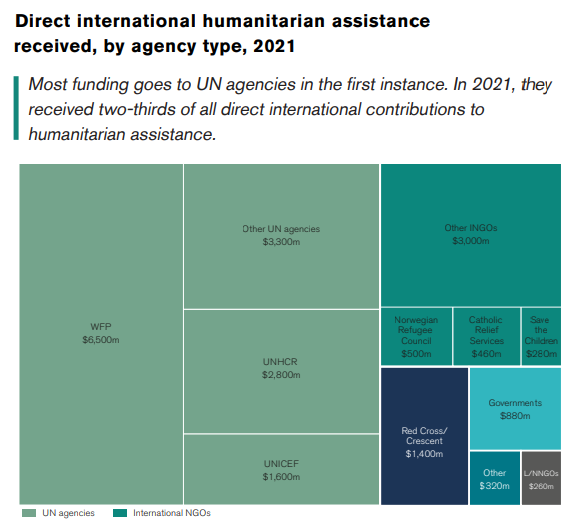 La maggior parte degli aiuti continua a fluire in primo luogo verso le agenzie delle Nazioni Unite: una media costante del 56% da donatori governativi tra il 2012 e il 2021. Negli ultimi quattro anni, quasi la metà degli aiuti umanitari diretti alle organizzazioni è andata a sole tre agenzie delle Nazioni Unite: il Programma alimentare mondiale (WFP), l'Alto Commissario delle Nazioni Unite per i rifugiati (UNHCR) e il Fondo delle Nazioni Unite per l'infanzia (UNICEF).