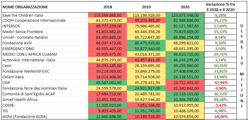 Nessun crollo quindi, ma sicuramente una battuta d’arresto rispetto alle tendenze di crescita alle quali le ONG si erano abituate in periodo pre-Covid (+ 19% dei bilanci sull’ultimo triennio, + 21% di risorse umane attive). Buono il bilancio delle big italiane del settore, nella classifica delle prime venti ONG italiane con un bilancio superiore ai 10 milioni non c’è visibilità della crisi, anzi i segni più prevalgono nettamente (in verde nella tabella gli aumenti rispetto all’anno precedente). Anche in questo caso la situazione sarebbe meno positiva se si tenesse conto della doppia erogazione del 5x1000 nel 2020.