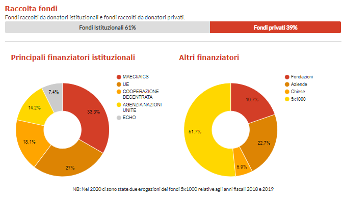 I fondi pubblici arrivano dai cosiddetti finanziatori istituzionali, più del 34% dall’Unione Europea (UE+Echo) quasi il 33% dall’Agenzia italiana per la Cooperazione AICS e dal MAECI (-3%), quasi il 18% dagli enti territoriali attraverso la cooperazione decentrata (-2%) e il restante 14% da agenzie delle Nazioni Unite e altre organizzazioni internazionali (+4%).