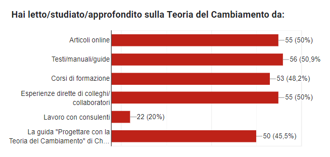 La maggior parte della conoscenza sulla ToC attualmente proviene da fonti differenziate e tutte più o meno dello stesso peso. Rispetto al 2017, si registra un notevole aumento delle offerte formative che trattano l’argomento (che si riflette nell’aumento di questa voce dal 17,4% al 48,2% quale fonte). Interessante anche la conferma della diffusione della guida di ChangeLab citata a inizio articolo (10.000 download hanno evidentemente inciso in qualche modo) e l’ingresso del settore consulenziale fra gli attori.