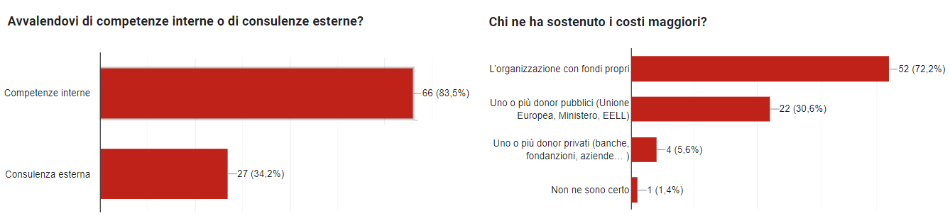 Oggi, come cinque anni fa, lo sviluppo della ToC è stato realizzato principalmente con risorse interne nell’83,5% circa dei casi e i costi maggiori, nella stragrande maggioranza delle risposte, sono stati coperti da fondi propri (72,2%) e, in misura significativamente minore, da donors istituzionali (30,6%) e privati (5,6%).