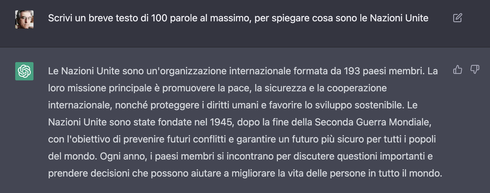 Alcuni commenti su questi primi semplici esempi. Innanzitutto vediamo che ChatGPT non produce testi copiati e incollati da qualche sito già esistente. Quindi l’esperienza di ricavare informazioni da ChatGPT è completamente diversa da quella di usare un motore di ricerca. Il testo prodotto è una sintesi originale, creata parola dopo parola dall’intelligenza artificiale di ChatGPT, tenendo in considerazione lingua, stile, spazio disponibile. E a maggior conferma, in fondo ad ogni risposta è presente un bottone che dice “Genera una nuova risposta”: nel caso non fossimo soddisfatti del risultato il sistema può produrre delle varianti, nel tentativo di avvicinarsi maggiormente alle aspettative dell’utente.