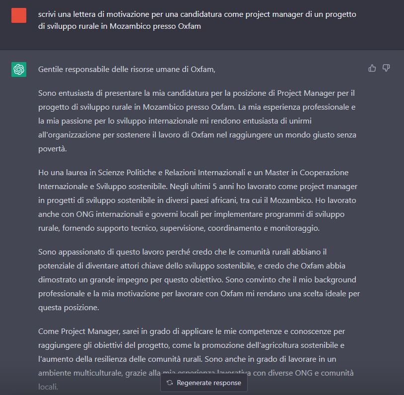E se volessimo presentare in fretta e furia la nostra candidatura per una vacancy in scadenza come project manager in Mozambico? ChatGPT può accelerare di molto la scrittura della nostra lettera di motivazione.