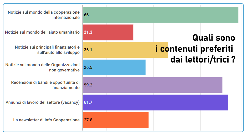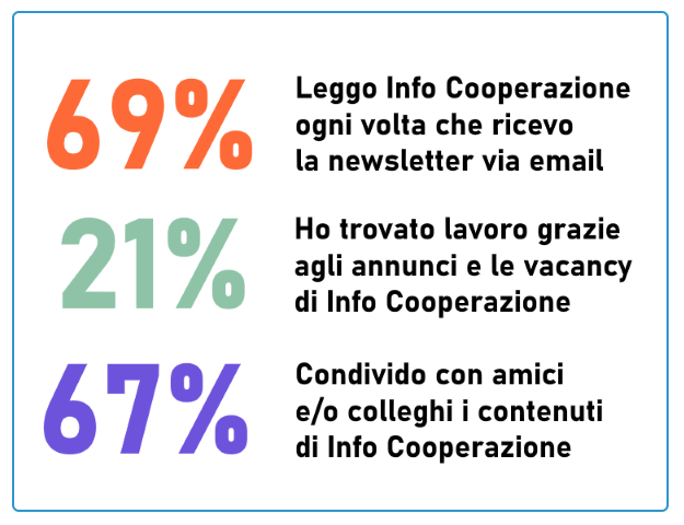 Ma quello che ci fa più piacere è sicuramente vedere che i rispondenti si percepiscono parte di una comunità che si identifica in valori comuni (87%) e ripone fiducia in Info Cooperazione (95%). I lettori ne apprezzano in particolare l’utilità, la semplicità e la capacità di influenzare il dibattito sulla cooperazione in Italia.