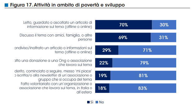 L’indagine 2023 ha anche analizzato il coinvolgimento attivo degli intervistati nelle iniziative di cooperazione allo sviluppo negli ultimi dodici mesi. La maggioranza ha affermato di aver ricevuto informazioni ed aver discusso all’interno dei propri circoli sociali temi relativi a povertà e sviluppo (70% e 69% del campione, rispettivamente). Queste figure diminuiscono drasticamente quando si considerano livelli di coinvolgimento che vadano oltre l’informazione: il 21% ha fatto una donazione a organizzazioni che si occupano di questi temi; il 19% ha partecipato alle attività di dette organizzazioni in maniera più o meno passiva (acquisirne la membership, seguirne le pagine sui social network, etc.); e solo il 18% ha svolto attività di volontariato in Italia o all’estero.