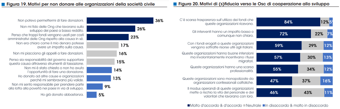 Tornando al mondo delle organizzazioni della società civile, l’indagine fornisce uno spaccato del gruppo di partecipanti che ha indicato di nutrire un basso livello di fiducia per queste organizzazioni (il 27% circa del campione) di esprimere il grado di accordo o disaccordo rispetto ad alcune affermazioni relative all’operato di questi attori. L’84% di questo sottogruppo ritiene che queste organizzazioni utilizzino i loro fondi in modo poco trasparente; fondi che il 59% pensa siano risorse che potrebbero essere invece utilizzate a beneficio dei cittadini italiani. In aggiunta, secondo il 72% di questo gruppo di intervistati l’impatto degli interventi realizzati dalle Osc è basso o difficile da determinare, e secondo il 57% le loro attività incentivano involontariamente i flussi migratori.