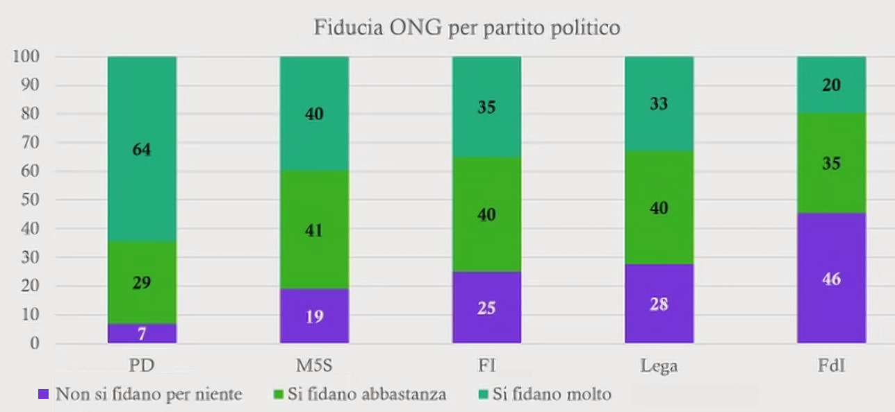 Più marcata la fiducia nelle ONG nei rispondenti che si identificano politicamente a sinistra: il 93% degli elettori del PD si fidano molto/abbastanza, 81% degli elettori M5S, 75% di FI, 73% della Lega e 55% degli elettori di FdI.