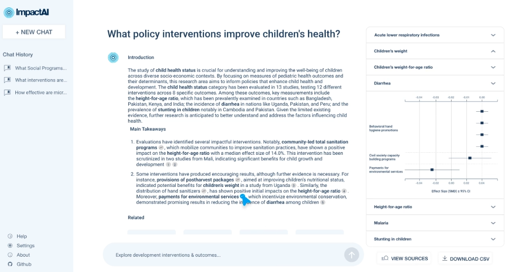 Si chiama ImpactAI, uno strumento avanzato di intelligenza artificiale sviluppato dalla Banca Mondiale e progettato per supportare il mondo della cooperazione e dello sviluppo globale. Lo strumento, in fase di sviluppo presso il DIME (World Bank's Development Impact Evaluation) in collaborazione con Google Accelerator è progettato per migliorare la pianificazione di interventi, le decisioni politiche e la misurazione dei risultati di sviluppo fornendo analisi in tempo reale su grandi quantità di dati, in particolare quelli dei paesi a basso e medio reddito. L'obiettivo è rafforzare i processi decisionali con approfondimenti basati sui dati, garantendo che le iniziative abbiano un impatto maggiore e siano allineate con le esigenze delle popolazioni beneficiarie.