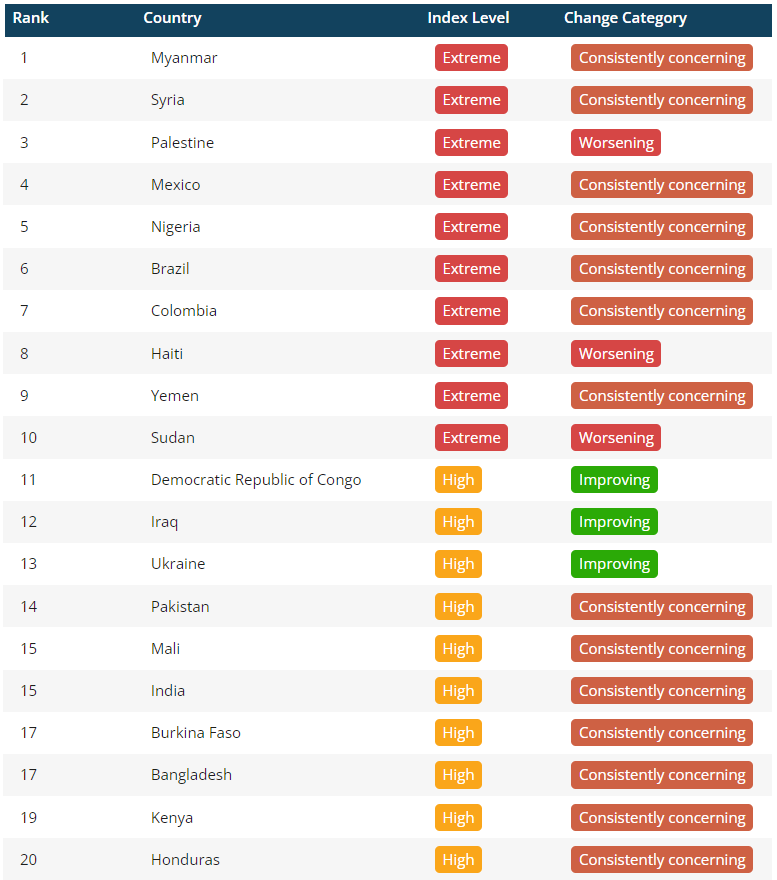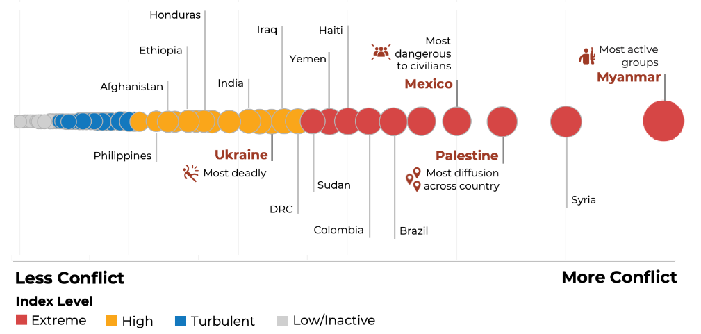 Dei paesi categorizzati con estrema violenza, due si trovano in Africa (Nigeria e Sudan), e il Sudan continua a peggiorare poiché le uccisioni di massa sono una caratteristica chiave di quel conflitto. Tre paesi si trovano in Medio Oriente (Palestina, Yemen e Siria), sottolineando la profondità dei problemi che persistono nella regione da decenni. Il Myanmar è l’unico paese asiatico con estrema violenza, ma rimane il caso di conflitto più difficile al mondo. Infine, quattro dei 10 luoghi estremamente violenti si trovano in America Latina (Messico, Brasile, Colombia e Haiti); Ad eccezione di Haiti, sono tutte considerate democrazie ed economie di mercato relativamente stabili nonostante siano destabilizzate da bande criminali, autorità contestate, corruzione e violenza contro i civili. In questi paesi non esistono grandi guerre tradizionali, ma piccoli conflitti multipli, mortali e pervasivi.