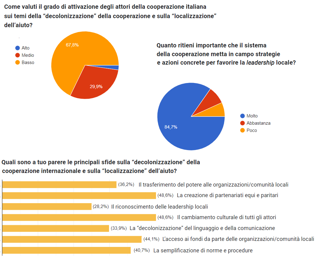 I dati forniscono una panoramica interessante sulla percezione e sul livello di attuazione dei principi della decolonizzazione dell'aiuto, un processo che negli ultimi anni ha guadagnato crescente attenzione a livello globale e mira a spostare l'equilibrio di potere e risorse dai tradizionali attori internazionali verso i partner locali, mettendo in discussione una sistema ormai consolidato da diversi decenni.