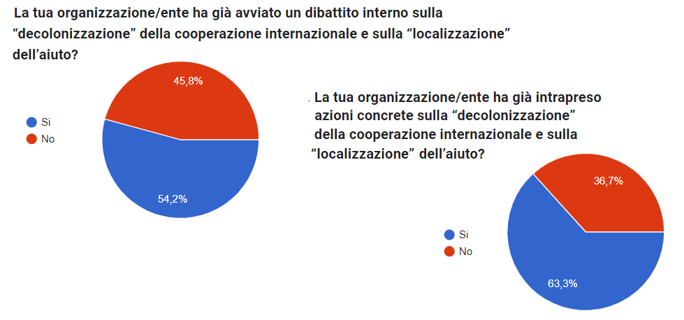 Nonostante gli operatori percepiscano un basso livello di attivazione del sistema della cooperazione italiana in merito, testimoniano una certa mobilitazione all’interno delle organizzazioni di provenienza. Il 54% dichiara che la propria organizzazione/ente ha già avviato un dibattito interno sulla “decolonizzazione” della cooperazione internazionale e sulla “localizzazione” dell’aiuto e nel 63% dei casi le organizzazioni hanno già intrapreso azioni concrete in merito.