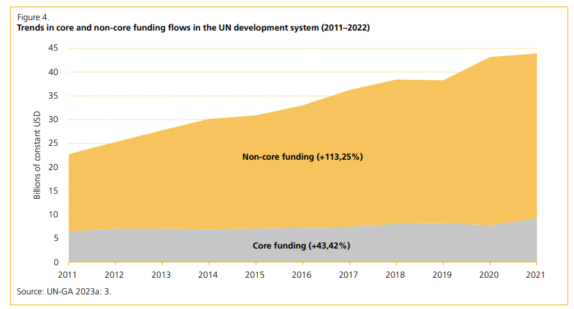 Solo due paesi – gli Stati Uniti (22%) e la Cina (15%) – attualmente contribuiscono per più del 10% al bilancio regolare delle Nazioni Unite. Nel ciclo 2022-2024, 16 paesi hanno contribuito tra l’1 e il 10%, mentre 175 Stati membri hanno contribuito meno dell’1%. Di questi ultimi, a 29 Stati è stato assegnato il tasso minimo di contribuzione (ovvero la soglia minima) pari allo 0,001% del bilancio regolare, che ammonta a 31.509 dollari ciascuno. Negli ultimi dieci anni, la crescita delle risorse stanziate nel sistema di sviluppo delle Nazioni Unite è stata guidata anche da un drammatico aumento dell’assistenza umanitaria. Gli aiuti umanitari tendono ad assumere la forma di contributi stanziati, poiché i donatori desiderano indirizzare i propri finanziamenti a crisi specifiche.