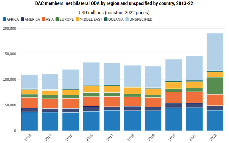 - Il volume dell’aiuto pubblico allo sviluppo (APS) ha raggiunto un nuovo massimo di 224 miliardi di dollari nel 2023 per il quinto anno consecutivo, principalmente grazie all’aumento degli aiuti per l’Ucraina e all’assistenza umanitaria, ma solo cinque paesi del Comitato di assistenza allo sviluppo (DAC) hanno rispettato il loro impegno di fornire 0,7% del RNL come APS.