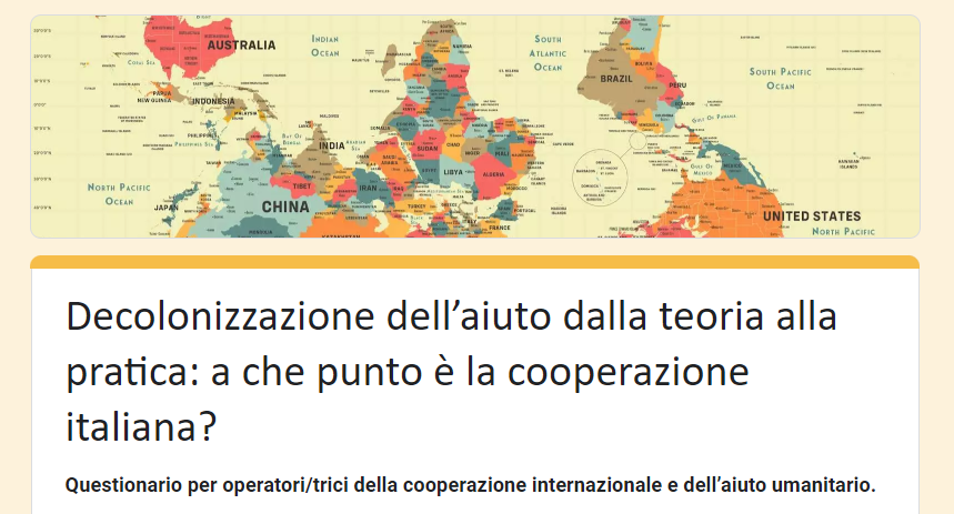 Abbiamo aperto una consultazione tra gli attori italiani coinvolti nella cooperazione e nell’aiuto umanitario per capire quale sia oggi il livello di conoscenza e comprensione del fenomeno della “decolonizzazione” della cooperazione internazionale e della “localizzazione” dell’aiuto e quale sia il grado di attivazione delle organizzazioni con misure specifiche e concrete.