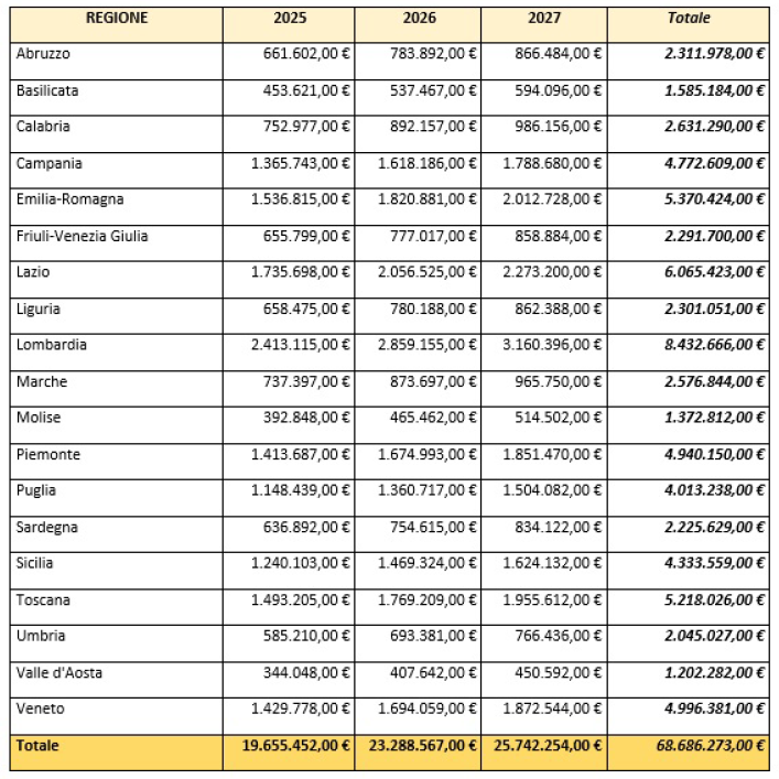 L’atto di indirizzo definisce inoltre la ripartizione regionale delle risorse, assegnate per il 30% del totale a titolo di quota fissa, per il 20% sulla base della popolazione residente al primo gennaio 2025, come da rilevazione Istat e per il 50% sulla base del numero degli ETS iscritti al RUNTS a inizio anno. La Lombardia con 8,4 mln è la prima regione per importo disponibile, a seguire il Lazio con poco più di 6 mln di euro e l’Emilia Romagna con 5,3 mln di euro.