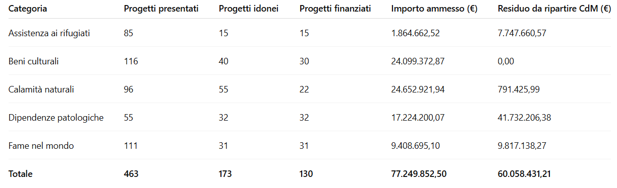 I documenti riportano le graduatorie ufficiali dei progetti ammessi al finanziamento nelle cinque categorie tradizionali – fame nel mondo, calamità naturali, assistenza ai rifugiati e minori stranieri non accompagnati, conservazione dei beni culturali, edilizia scolastica – a cui dal 2023 si è aggiunta la nuova voce “recupero dalle tossicodipendenze e altre dipendenze patologiche”.