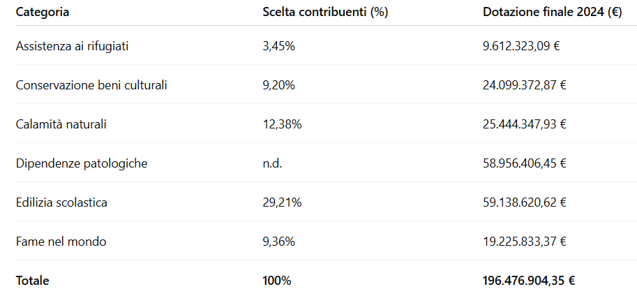La novità più importante del 2024 è la categoria “recupero dalle tossicodipendenze e altre dipendenze patologiche”, introdotta formalmente nel 2023 e che dal 2027 sarà selezionabile direttamente dai contribuenti. Il Governo ha già cominciato a indirizzare risorse significative dai residui dell’anno passato: 32 progetti finanziati per un totale di 17,2 milioni di euro.
