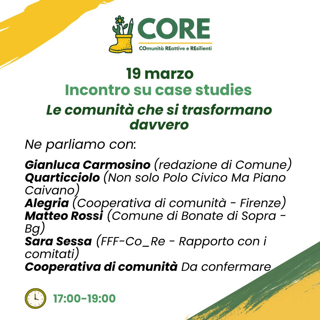 - Percorsi interregionali in presenza: incontri macroregionali sui diversi ambiti di comunità (energia, cibo, welfare, ecc.), con momenti di confronto, scambio di buone pratiche e co-progettazione delle azioni locali.