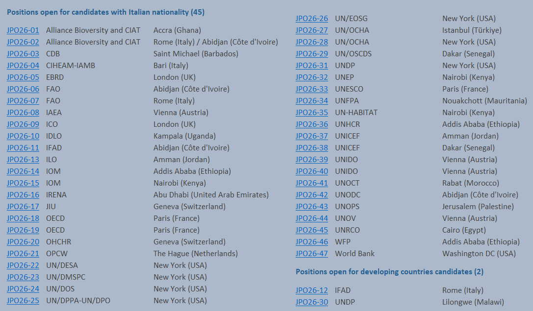 Per l’edizione 2026/2027, le candidature sono aperte fino al 5 maggio 2026 alle ore 15:00. Sono disponibili 47 posizioni che coprono diversi ambiti — dallo sviluppo sostenibile alle politiche economiche, dai diritti umani alla gestione dei progetti — e sono distribuite in varie sedi nel mondo. Ogni posizione è descritta nei Termini di Riferimento, che specificano nel dettaglio attività, requisiti e competenze richieste.